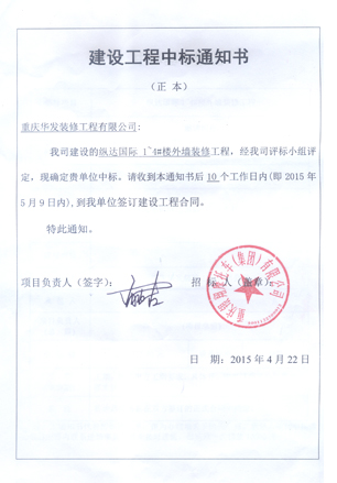 本工程是在招標項目,經過數輪投標、談判,我司在眾多裝修公司中脫穎而出,成功中標縱達國際1-4#樓外墻裝修工程。