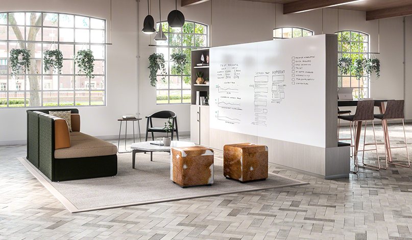 由于Steelcase尋求在開放空間和個人辦公室之間找到一個折衷方案,所以在他們在辦公室裝修中除了工作站之外,該公司還提出了協作要素。為了支持團隊合作和工作場所內的共享,這些元素允許為演示和會議以及接觸設置一個開放的布局空間。