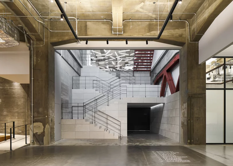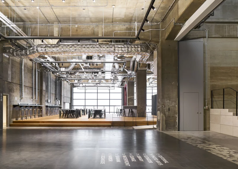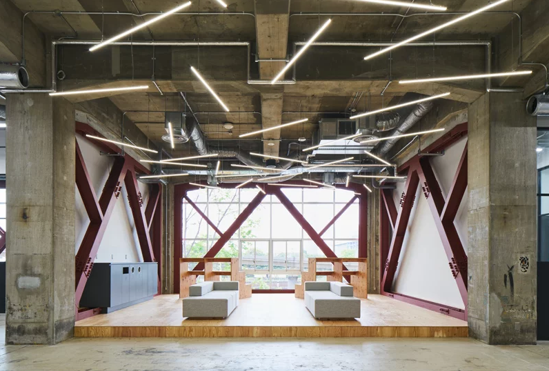 占地面積7500平方米、天花板高度6米的寬敞空間中,辦公室裝修設計利用現(xiàn)有空間的潛力和規(guī)模感,通過使用抗震支撐、涂有防銹漆的休息室、卡車泊位坡道以及簡單清理過的現(xiàn)有混凝土墻,辦公室裝修設計還充分利用了現(xiàn)有空間的潛力和規(guī)模感。