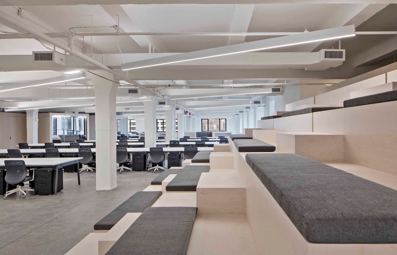 辦公室裝修在主空間內,可移動的全高度耙式座位看臺可以在物理上改變主空間的規模,并設置各種配置,從較小規模的會議區到每月數百人的全員集會。此外,辦公室裝修中較小的可移動休息室家具和播種機的設計是為了創造不斷變化的配置和機會,讓員工在一天內以任何可以想象的方式見面和工作。這是對辦公室裝修現有外墻的贊美,外墻的建造是為了創造緩沖的座位區域,讓人們可以從各個方向欣賞動態的景色。