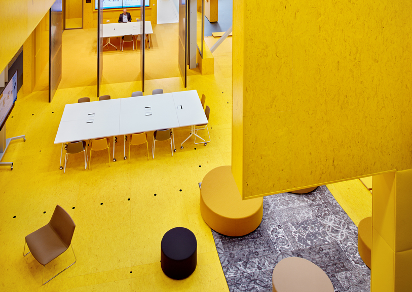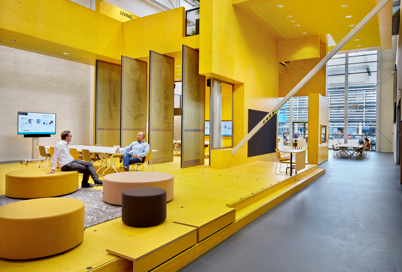最后的辦公室裝修設(shè)計靈感來自于建筑實(shí)驗家和藝術(shù)家的一件黃色的3D小藝術(shù)品。克里金·德科寧,將大禮堂內(nèi)現(xiàn)有的四個不同樓層連接起來,為工作提供各種解決方案。
