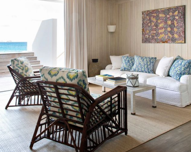 建筑師Kirscher設計的新海灘套房提供帶私人游泳池的田園風格露臺。沙發和藤椅(serena&Lily)覆蓋著ikat面料(IDO擴散)。靠墊(設計師協會)。