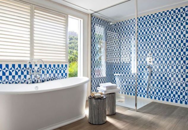 浴室朝向花園,其晨光透露出所有的輝煌。藍色和白色摩洛哥zelliges(別墅巴黎)圖表比賽。陶瓷凳子(Asiatides),浴缸(Devon&Devon),水龍頭(Lefroy Brooks)。